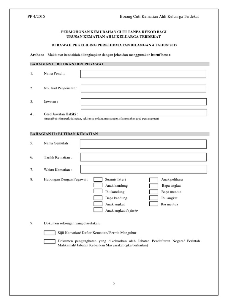 Pekeliling Cuti Tanpa Rekod Kematian Bahagian I Butiran Diri Pegawai Borang Cuti Kematian Ahli Keluarga Terdekat Permohonan Kemudahan Cuti Tanpa Rekod Bagi Urusan Kematian Ahli Keluarga Terdekat Di Bawah Pekeliling Pdf from demo.pdfslide.net Borang cuti kematian ahli keluarga terdekat. Staf perlu mengisi borang cuti tanpa rekod dalam tempoh 7 hari selepas hari kematian. Maklumat hendaklah dilengkapkan dengan jelas dan menggunakan huruf besar. Cuti urusan kematian keluarga terdekat. Apa, sih, sebenarnya definisi keluarga bahagia itu? terkini borang rentas negeri pkpb pdrm (pdf, gambar) | borang permit contoh surat kebenaran rentas negeri / borang permit pergerakan pkpb tersebut boleh melalui online je ehee. Borang kemas kini ogos 2017 1 borang permohonan cuti tanpa rekod (ctr) bagi urusan kematian ahli keluarga terdekat (pekeliling perkhidmatan bilangan 4 tahun 2015) arahan: Ahli keluarga yang diambil kira ialah: