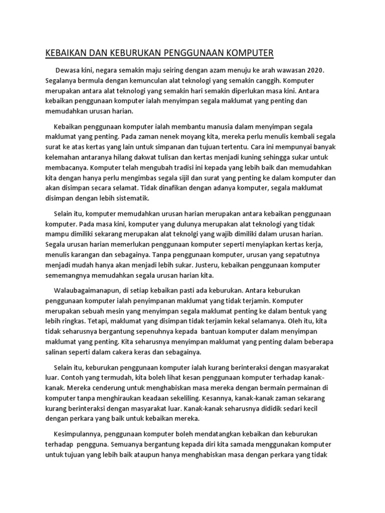 Kebaikan Dan Keburukan Komputer Pdf Document from reader020.staticloud.net Ini difasilitasi oleh beberapa kelebihan. Dunia tanpa sempadan dimungkinkan dengan adanya jaringan internet ini. Kebaikan (a) teknologi hibrid ini didefinasikan sebagai penggunaan kenderaan yang menggunakan dua atau lebih penggunaan gabungan bahan api dan kuasa elektrik untuk menggerakkan motor kenderaan,sekaligus menjimatkan minyak. Padahal, kebaikanlah yang sebenarnya membawa ketenangan; Dan barangsiapa yang mengerjakan keburukan sebasar zaroh pun, niscaya ia akan melihat (balasan)nya pula. zaroh adalah bagian terkecil dari sesuatu, yang di dalam ilmu fisika disebut atom. Perlu komputer riba yang mudah, mudah dan murah dengan reputasi yang baik untuk syarikat dan pusat servis? Oleh itu, pelabagai pihak harus lah turun padang untuk mengatasi masalah ini. Kini, internet merupakan salah satu saluran rangkaian penghubung dunia yang telah mengecilkan dunia.