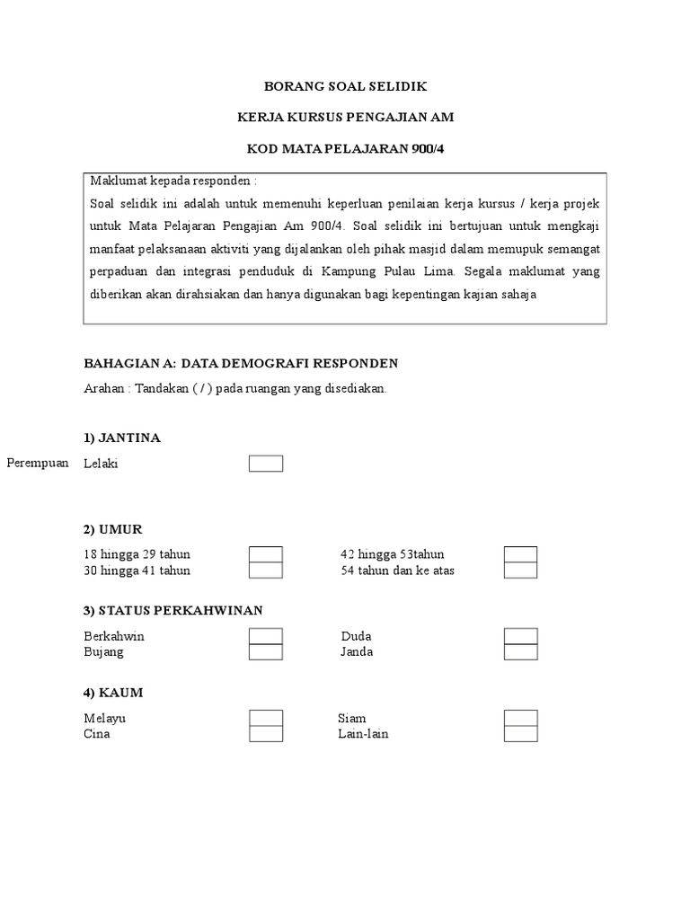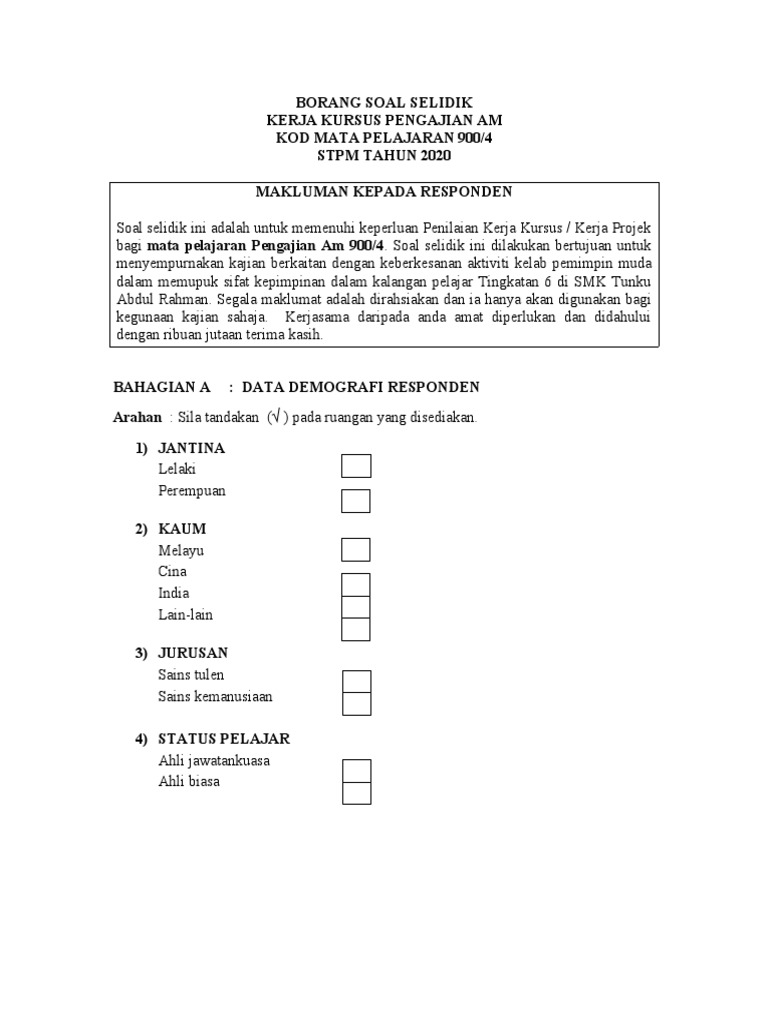 Related : Contoh Borang Soal Selidik Kerja Kursus Pengajian Am : Contoh Kerja Kursus Pbs Stpm Pengajian Am 4 - Contoh borang soal selidik (maklumat diri responden)..