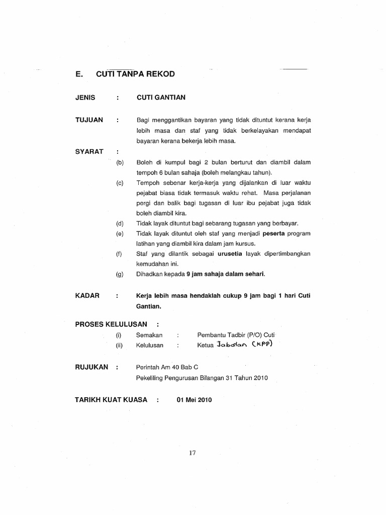 ( perintah am 41 & 57 bab c,surat pp bil.5/1985, pp bil.9/1991 ) syarat dan kelayakan : Cuti tanpa rekod menghadiri temuduga. Cuti tanpa rekod menghadiri temuduga. Begitu juga dengan guru2 kita jika sekiranya mereka ingin menghadiri temuduga kenaikan pangkat ke dg41. Jul 05, 2009 · seperkara perlu diingatkan bahawa untuk menghadiri temuduga kita seharusnya mengambil cuti rehat kerana tiada peruntukan untuk membolehkan kita mengambil cuti tanpa rekod.