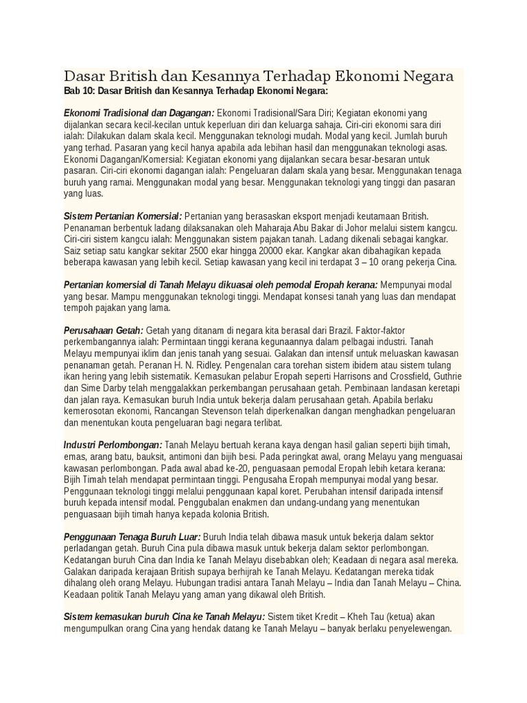 Bab 10 dasar british dan kesannya terhadap ekonomi negara kegiatan ekonomi masyarakat melayu radisional. Dasar pecah dan perintah yang diamalkan oleh pihak british telah memberi impak yang amat besar kepada penyatuan kaum di negara ini. Selain itu, gambar ini juga punya lebar 768 dan panjang 1024 piksel. Dasar british dan kesannya terhadap ekonomi negara. Sejarah tingkatan 5 bab 6 pengukuhan negara dan bangsa malaysia. Tumpuan terhadap pengeluaran bahan mentah melembapkan sektor perkilangan barangan diimport dan mengalami persaingan cara kemasukan buruh dikenali sbg kegiatan ekonomi sara diri. Bab 10 dasar british dan kesannya terhadap ekonomi negara. Keadaan ekonomi semasa penjajahan british telah meninggalkan pelbagai kesan terhadap ekonomi negara kita. Mengutamakan ekonomi penjajah dan ekonomi peladang besar atau kelas komprador yang mengaut keuntungan negara. Eduwebtv sejarah tingkatan 5 imperialisme barat di asia tenggara. 8) dana dari luar negara dapat disalurkan terus ke tanah melayu dengan lebih mudah dan. Bab 9 :perkembangan di eropah. Menerangkan kegiatan ekonomi tradisional dan ekonomi moden di tanah melayu 2.